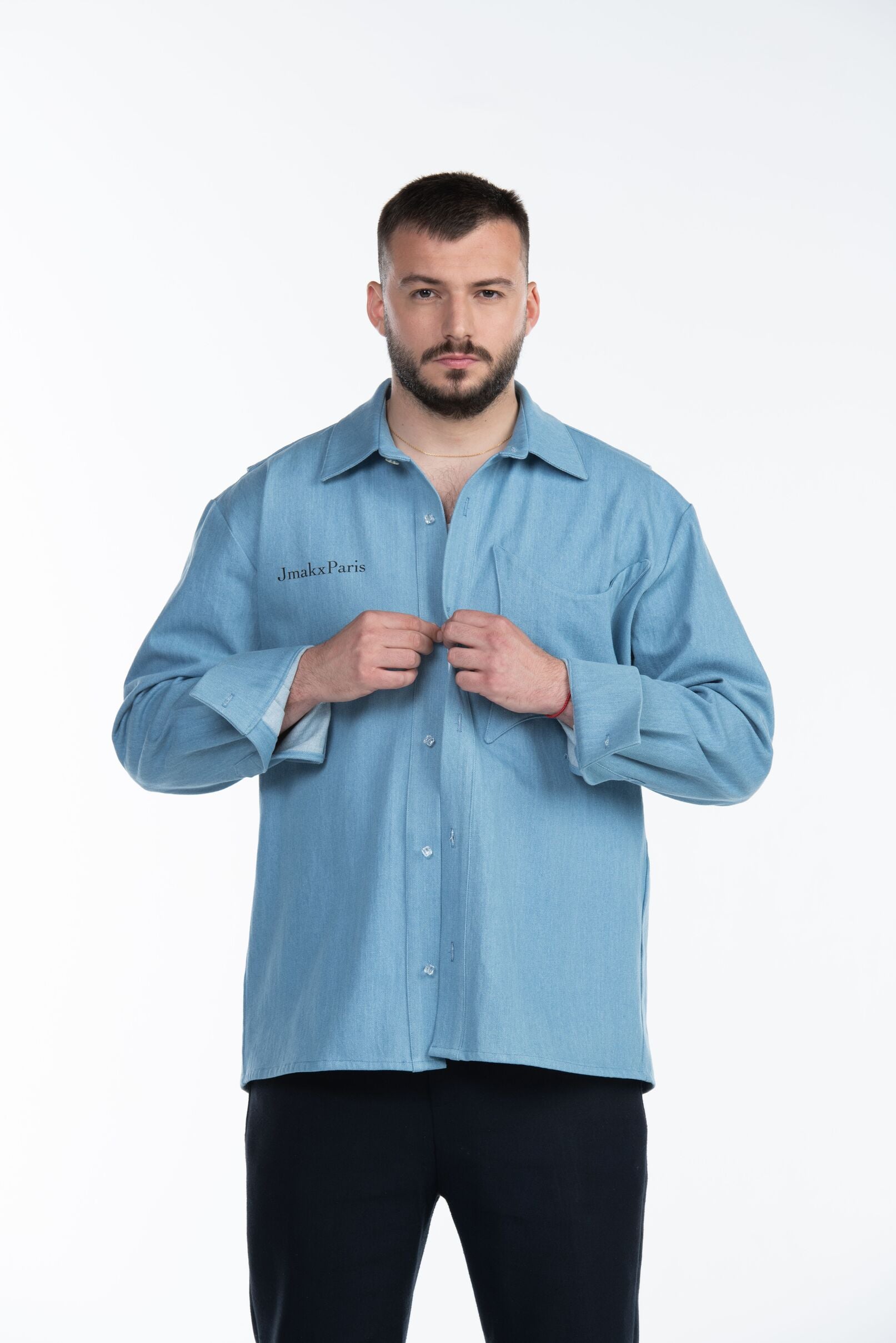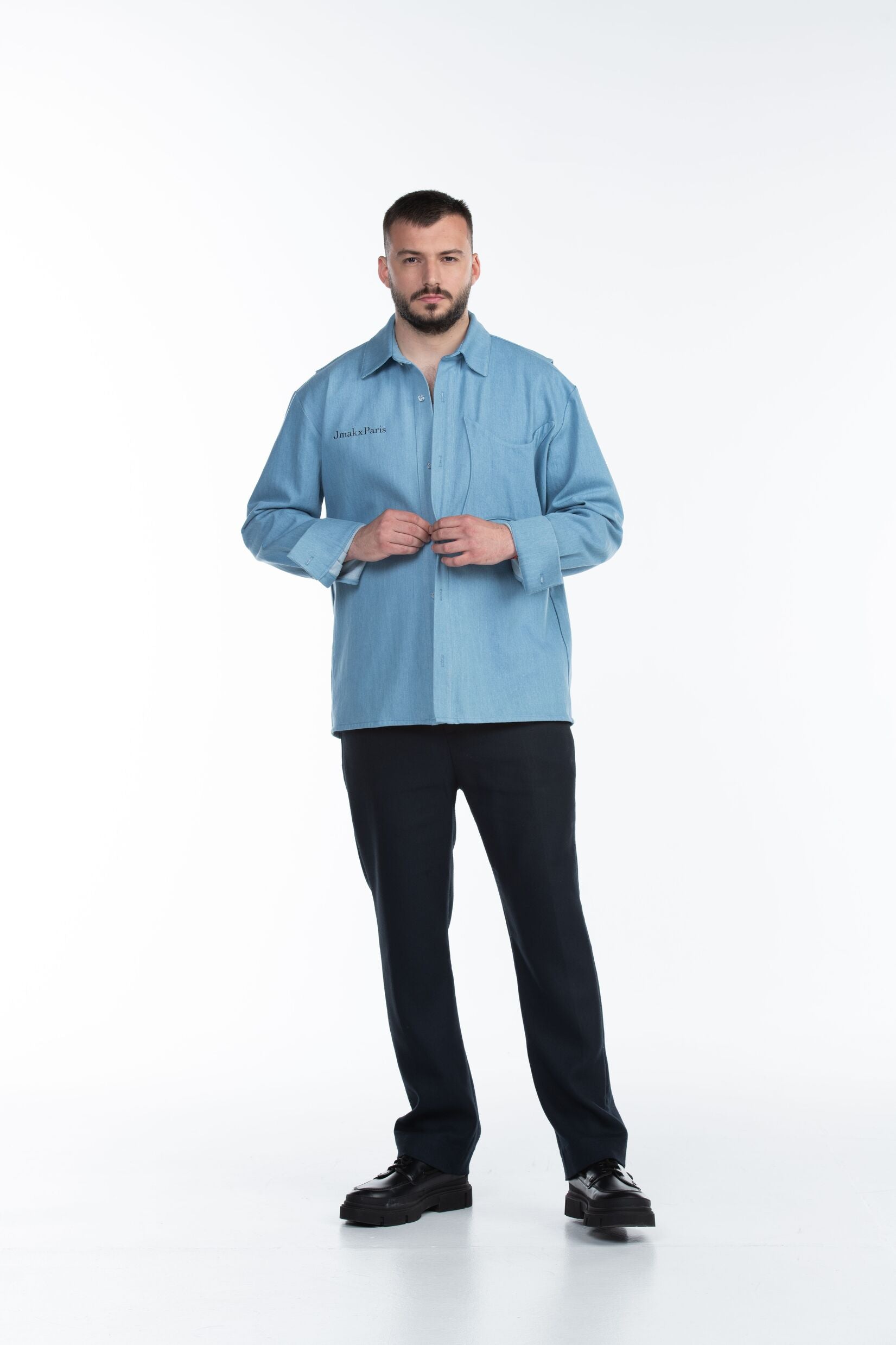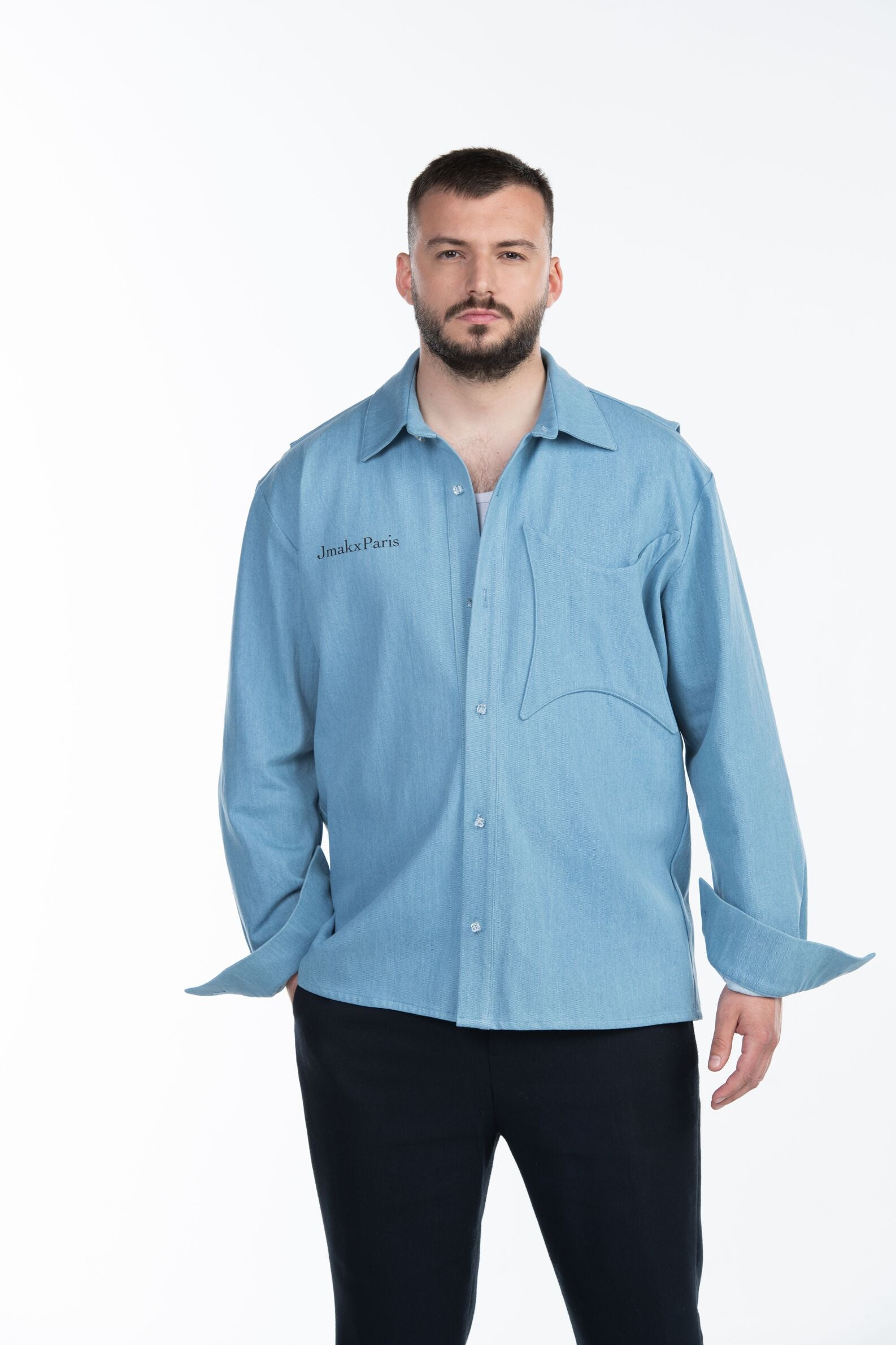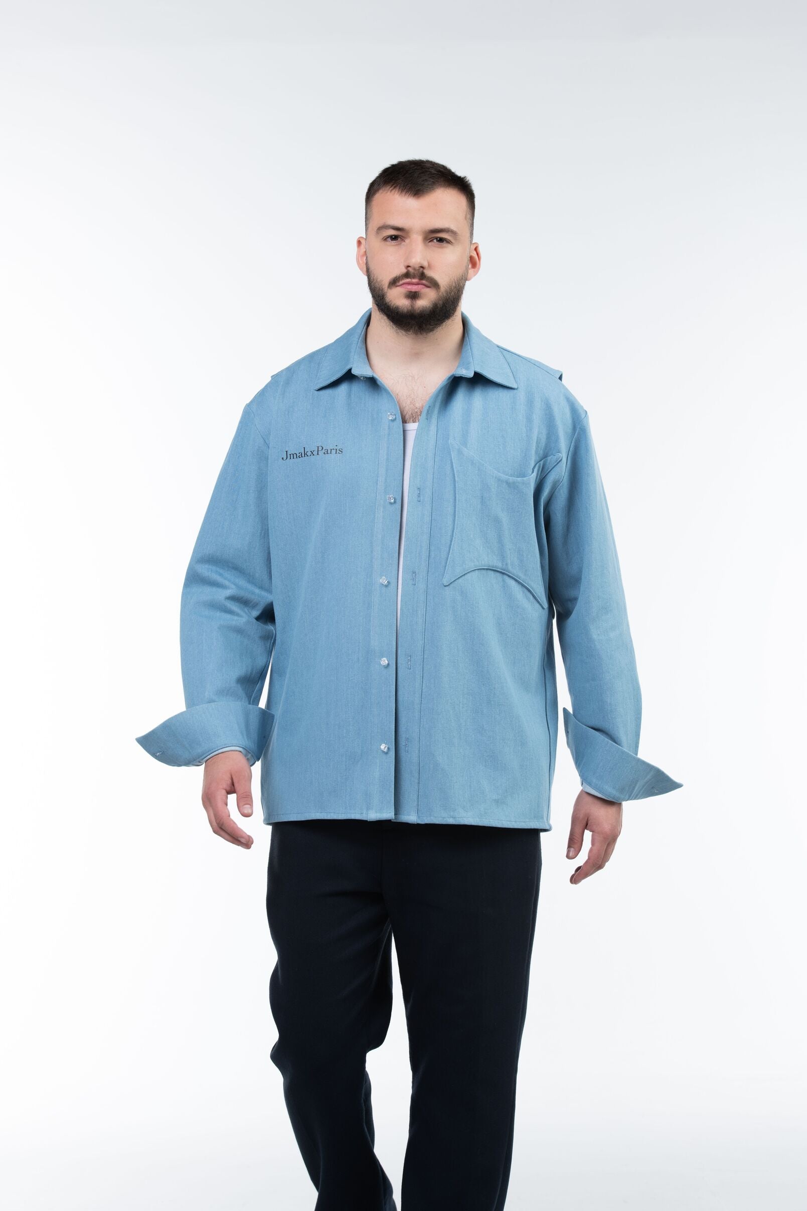 Elle est sublimé par la signature Jmakxparis sur la poitrine et du slogan amblematique de la marque sur la partie dorsale, tandis qu'une poche poitrine étoilée plaquée complète le devant, sa patte de boutonnage est sublimée par des boutons transparents légèrement brillants.