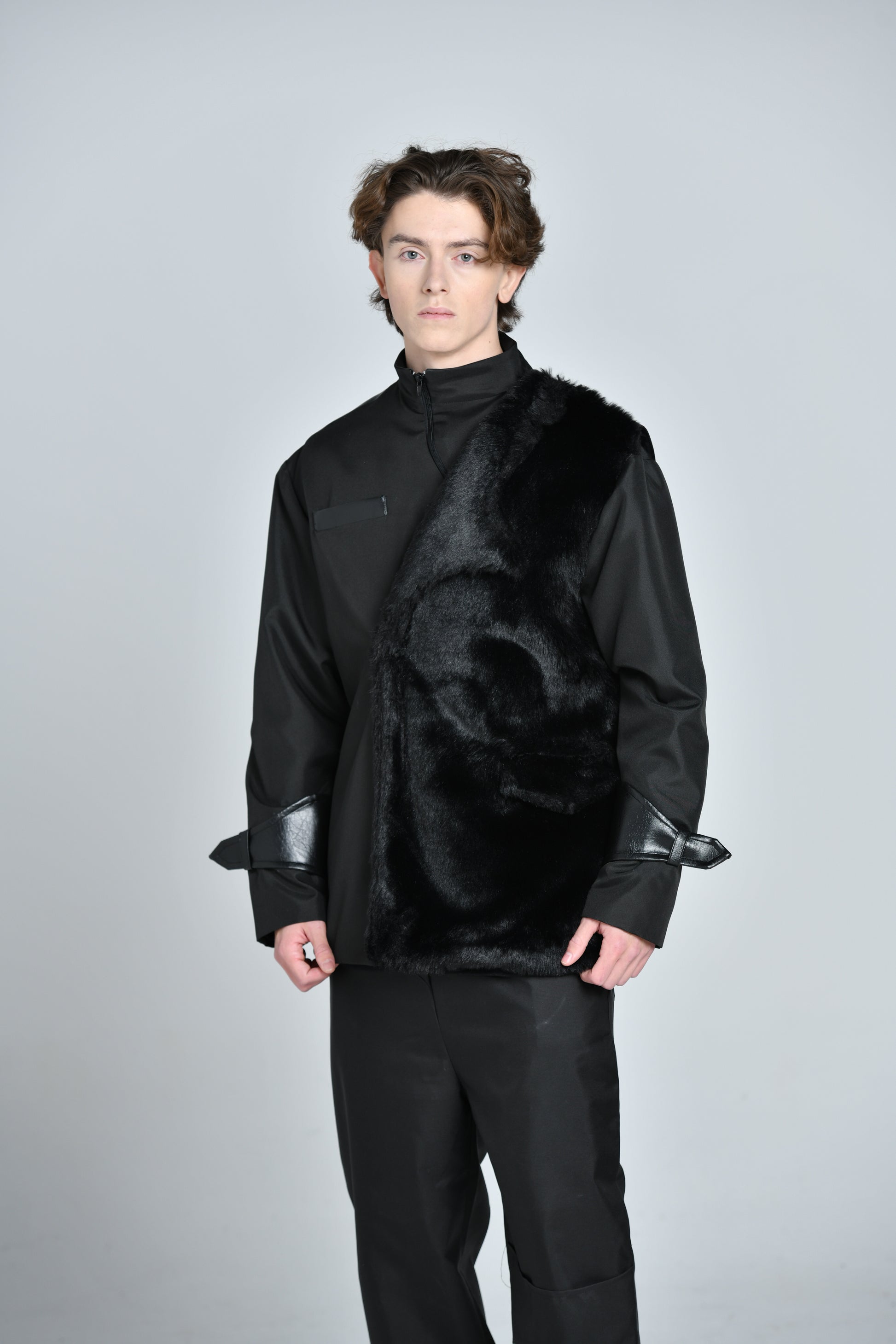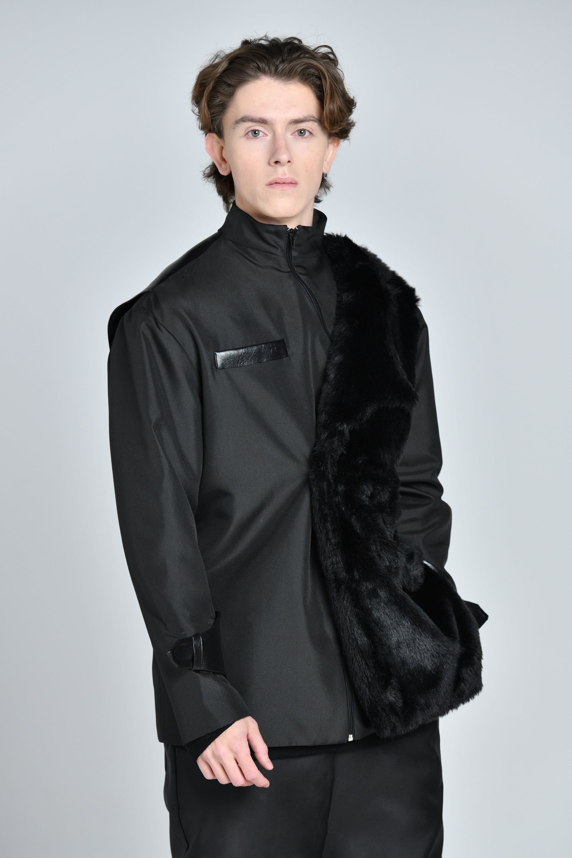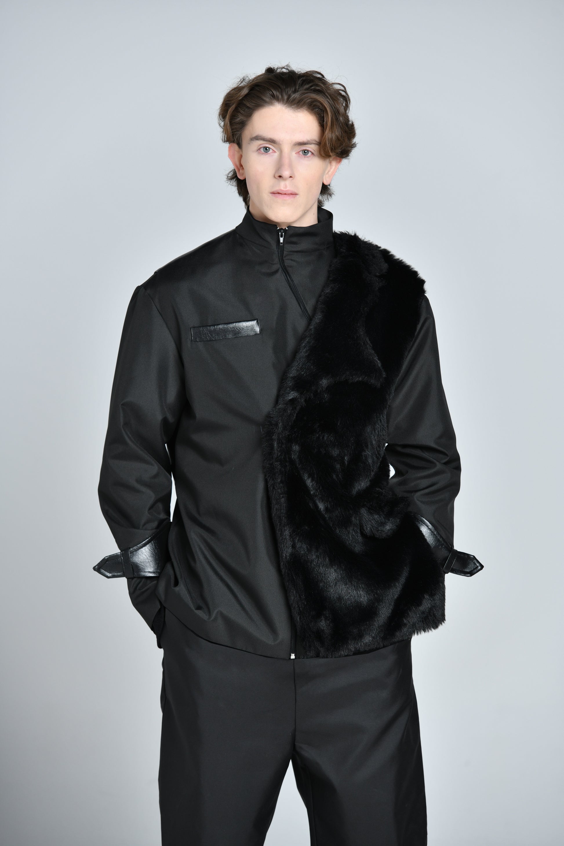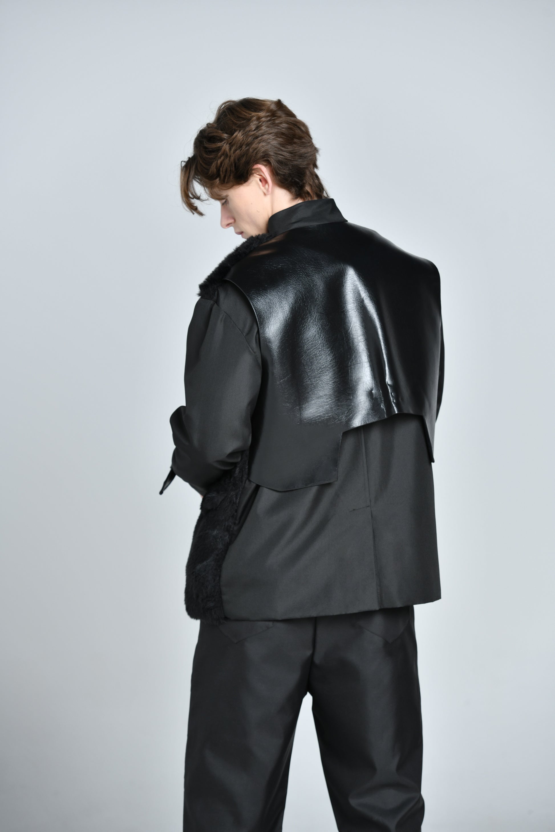 Le tissu technique mate se marie parfaitement à l’empiecement trompe oeil d’un blazer à col crainté revisité en fourrure synthétique. la partie dorsale arbore l’empiecement signature jmakxparis, et le pantalon associe élégance et sport-wear grace à sa coupe droite légèrement évasé avec une fourche basse pour créer ce sentiment de confort.