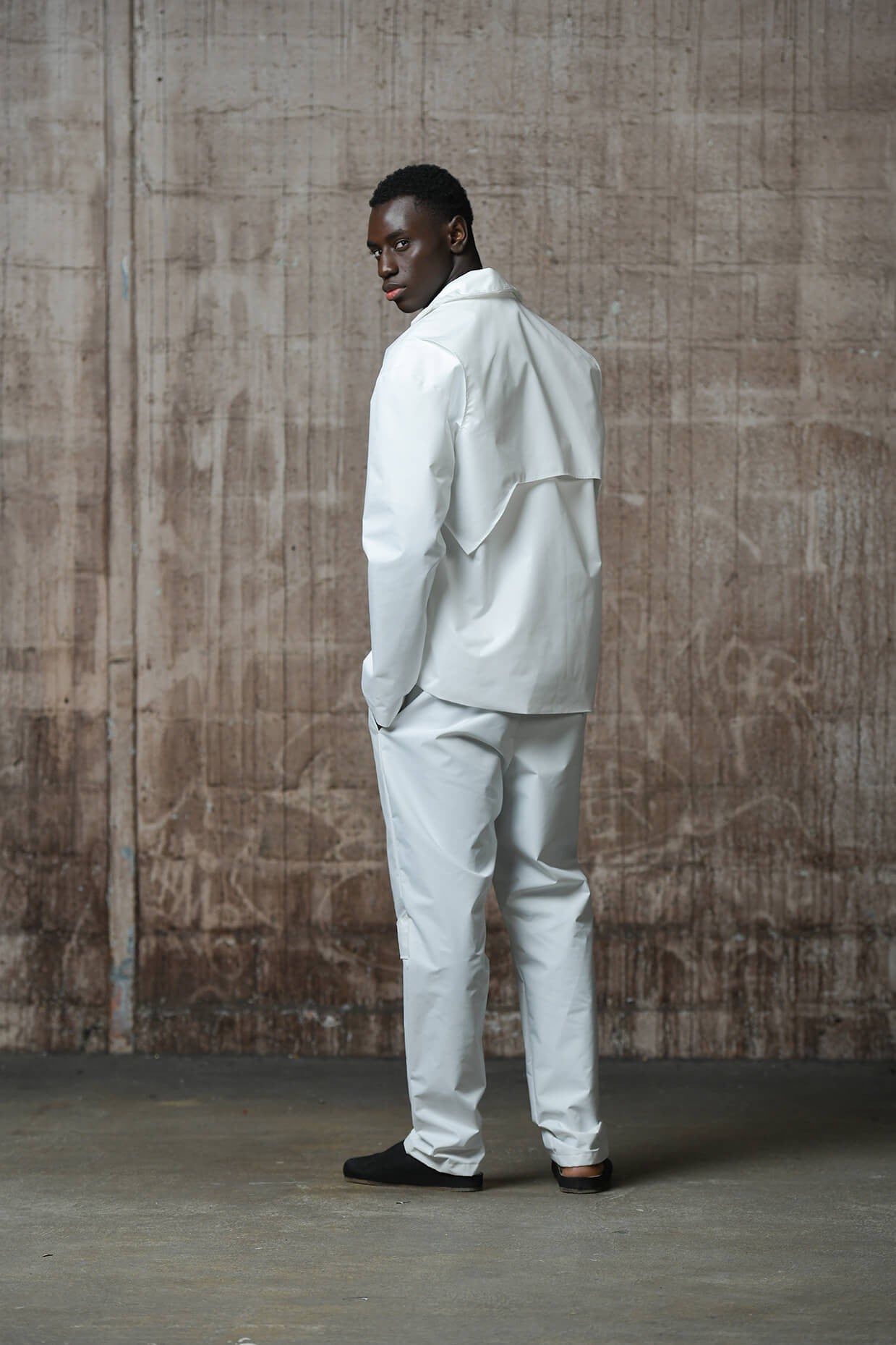 Elle est composée d’une veste col montant et d’une patte de boutonage courbée ainsi que le logo