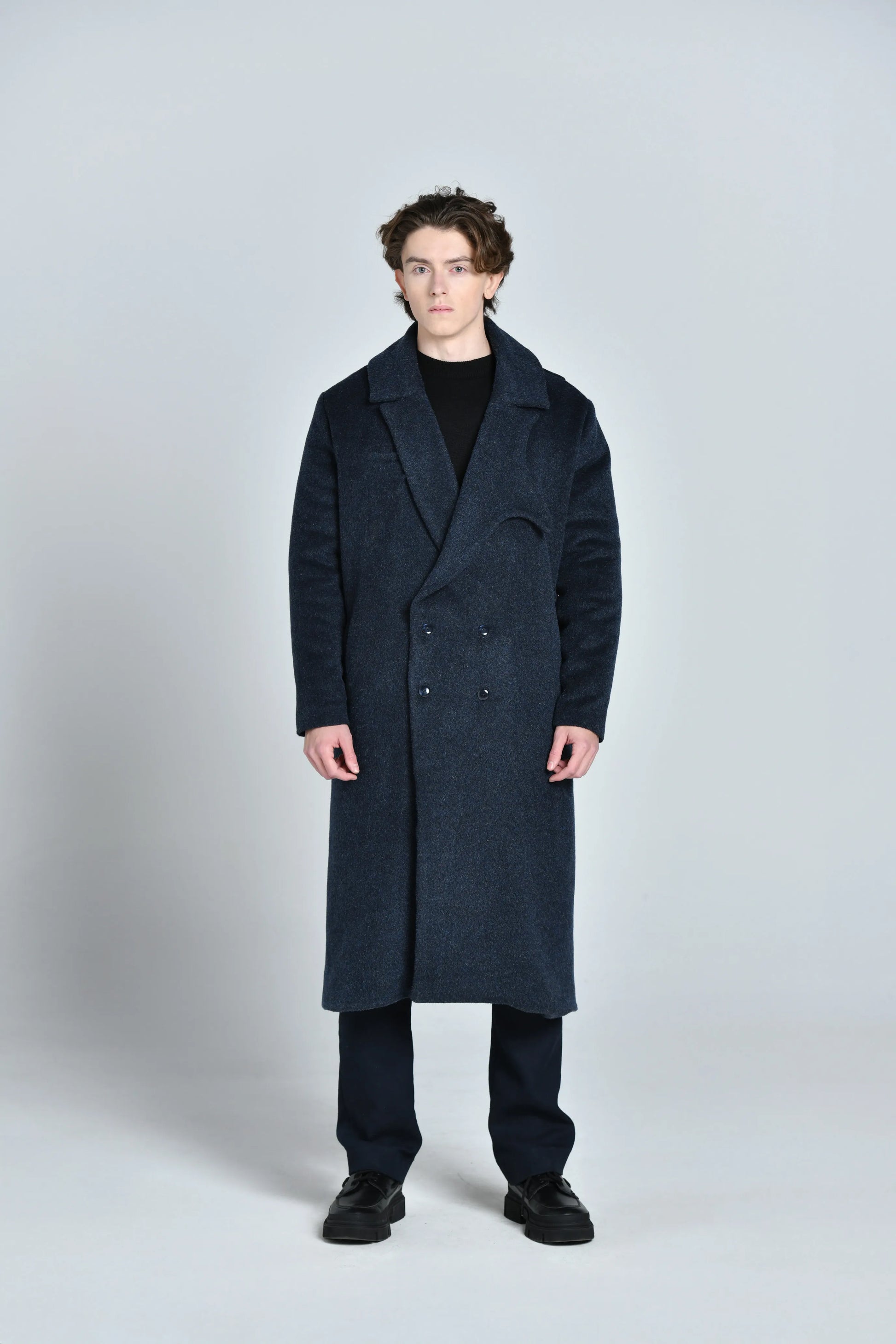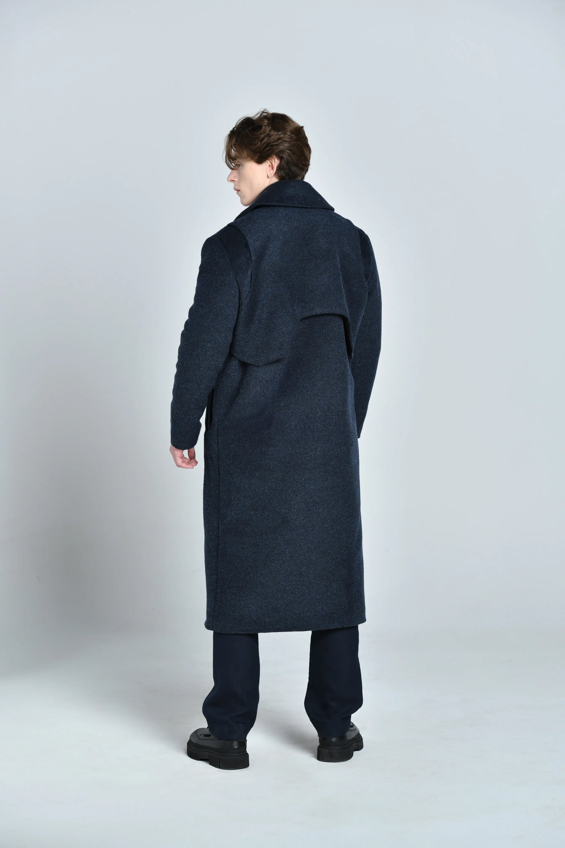 Ce manteau propose une silhouette ample au look moderne et authentique. Confectionné en toile de laine et mohair, il se distingue par son design sur le col a revers en pointe revisité, ainsi que sa mixture de matières et couleurs entre bleu nuit et noir, laine et mohair.