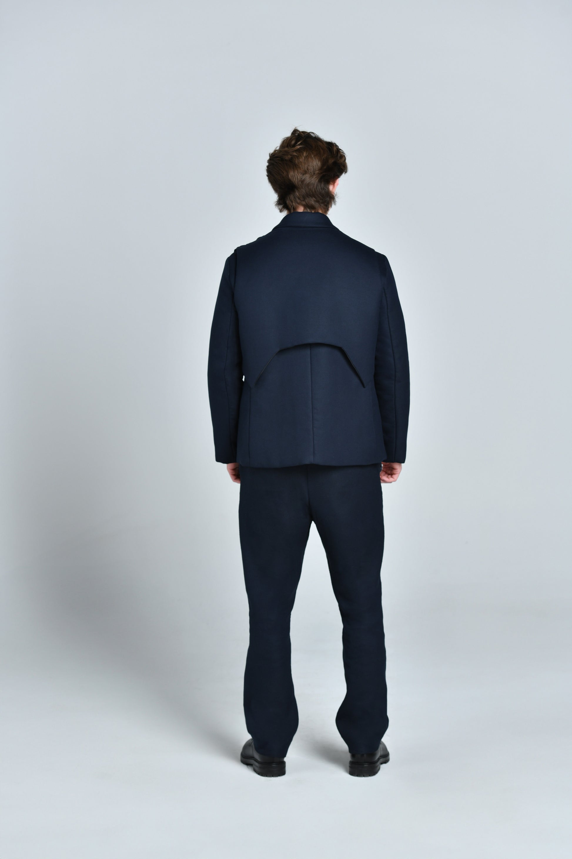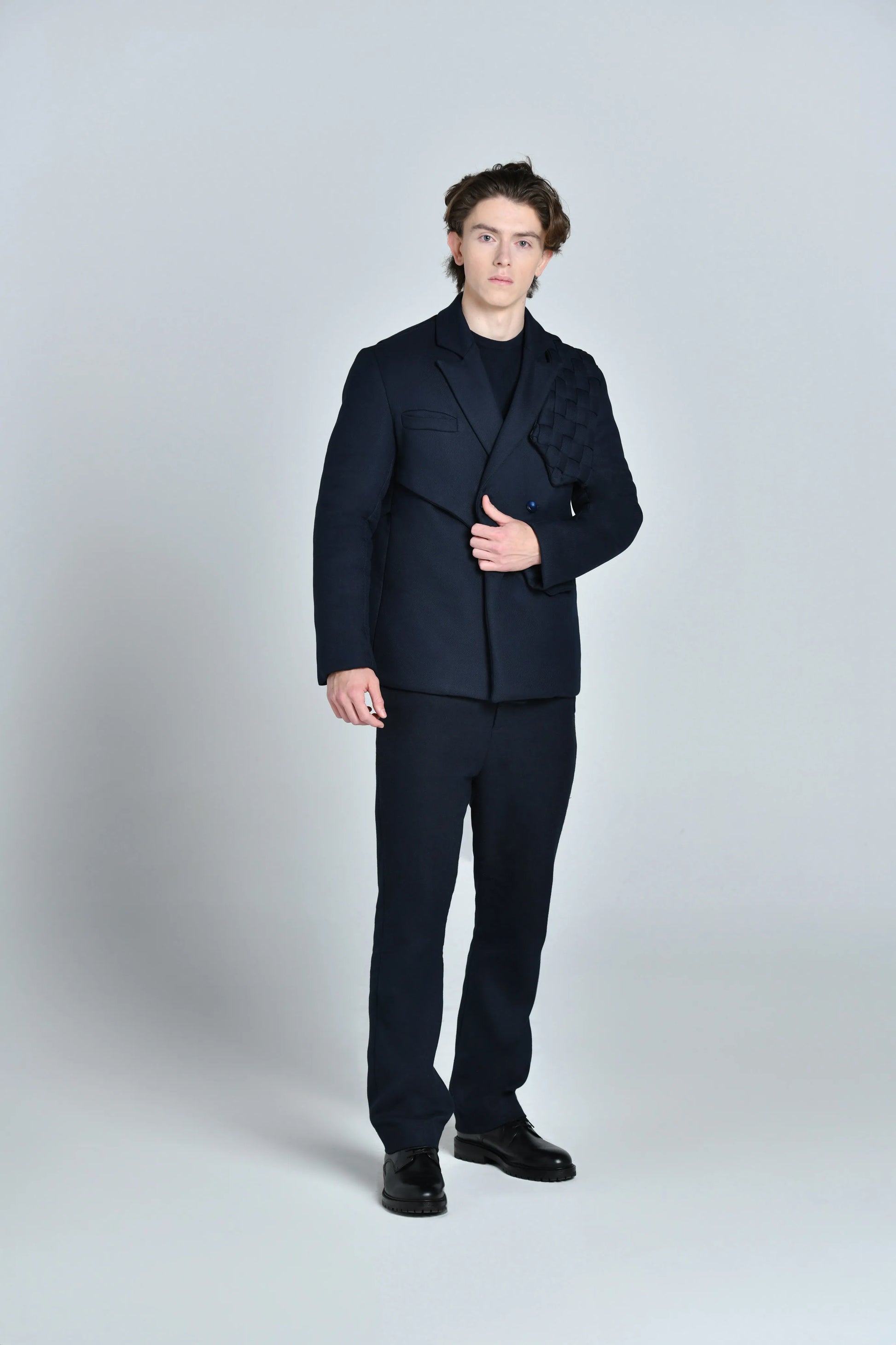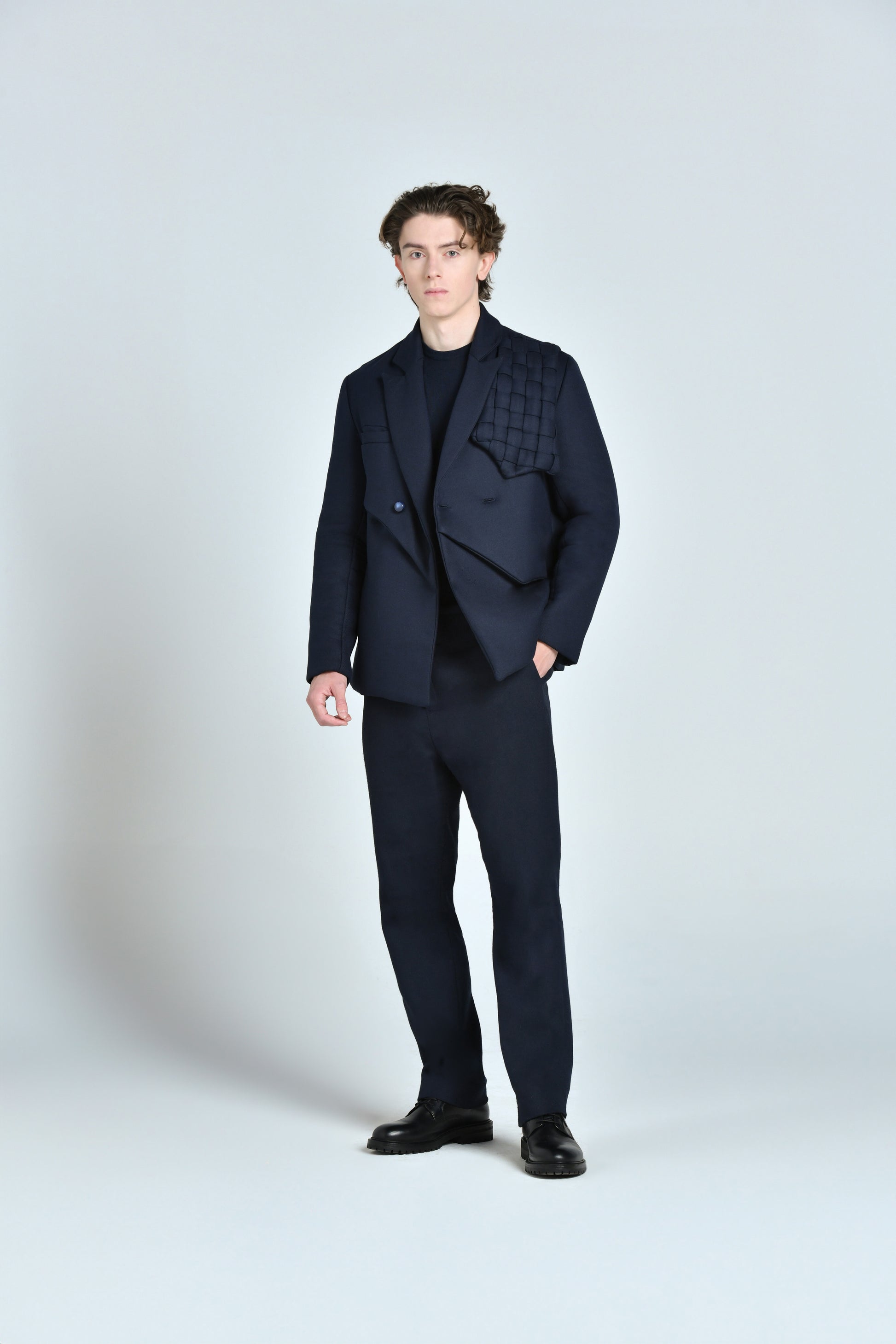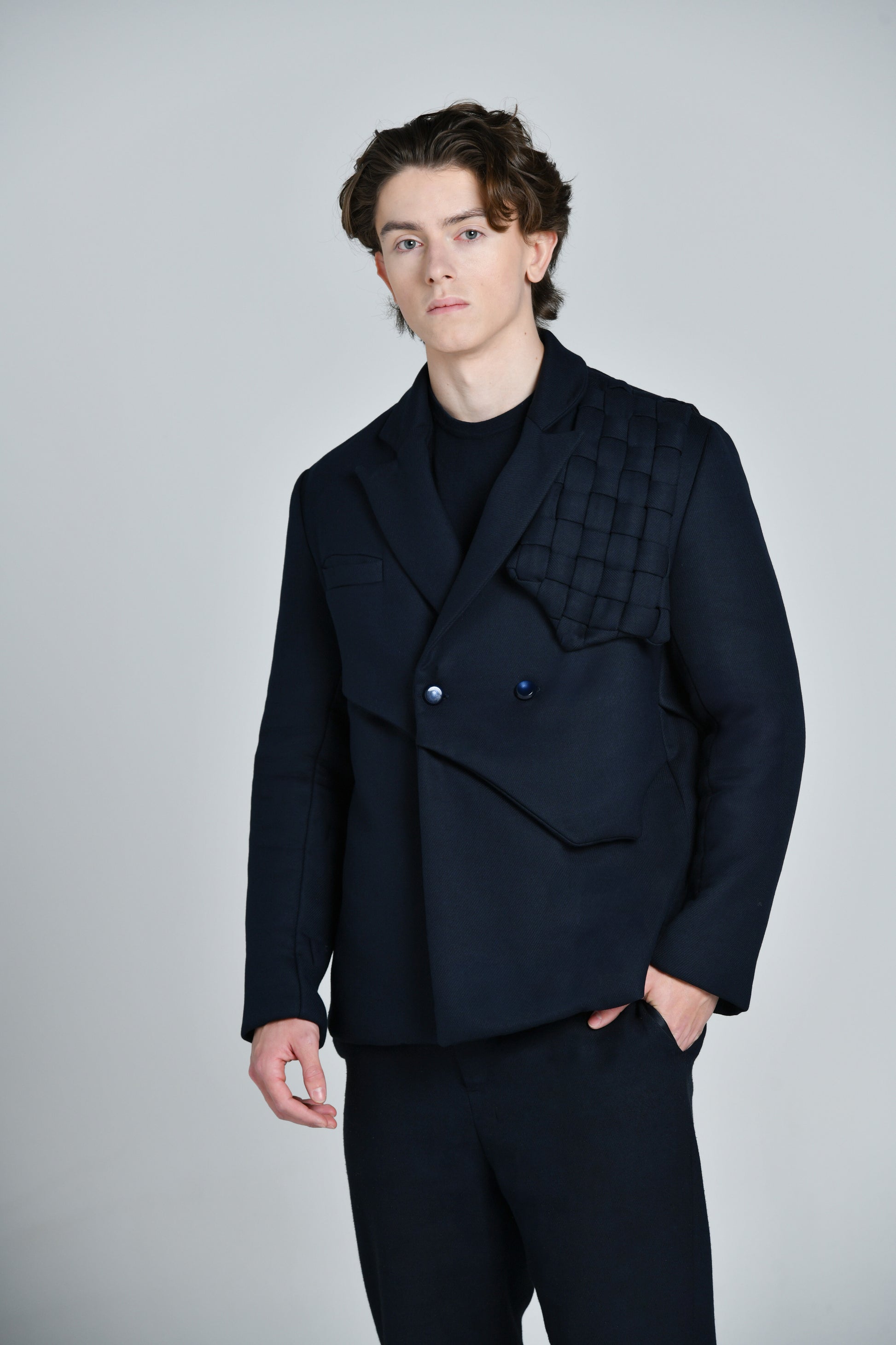 Mettant le tailoring au cœur de ses creations, Alvin Junior Mak, Directeur Artistique des collections masculines et féminines , modernise l'esthétique de la veste croisée. Confectionnée en toile de laine vierge mélangée bleu nuit, cette veste à double boutonnage présente un revers en pointe sublimé par l’empiecement de l’épaulette tressée revisité qui met en valeur le savoir-faire de l’artisanat africain, ainsi que d’un effet trompe oeil du gilet revisité.