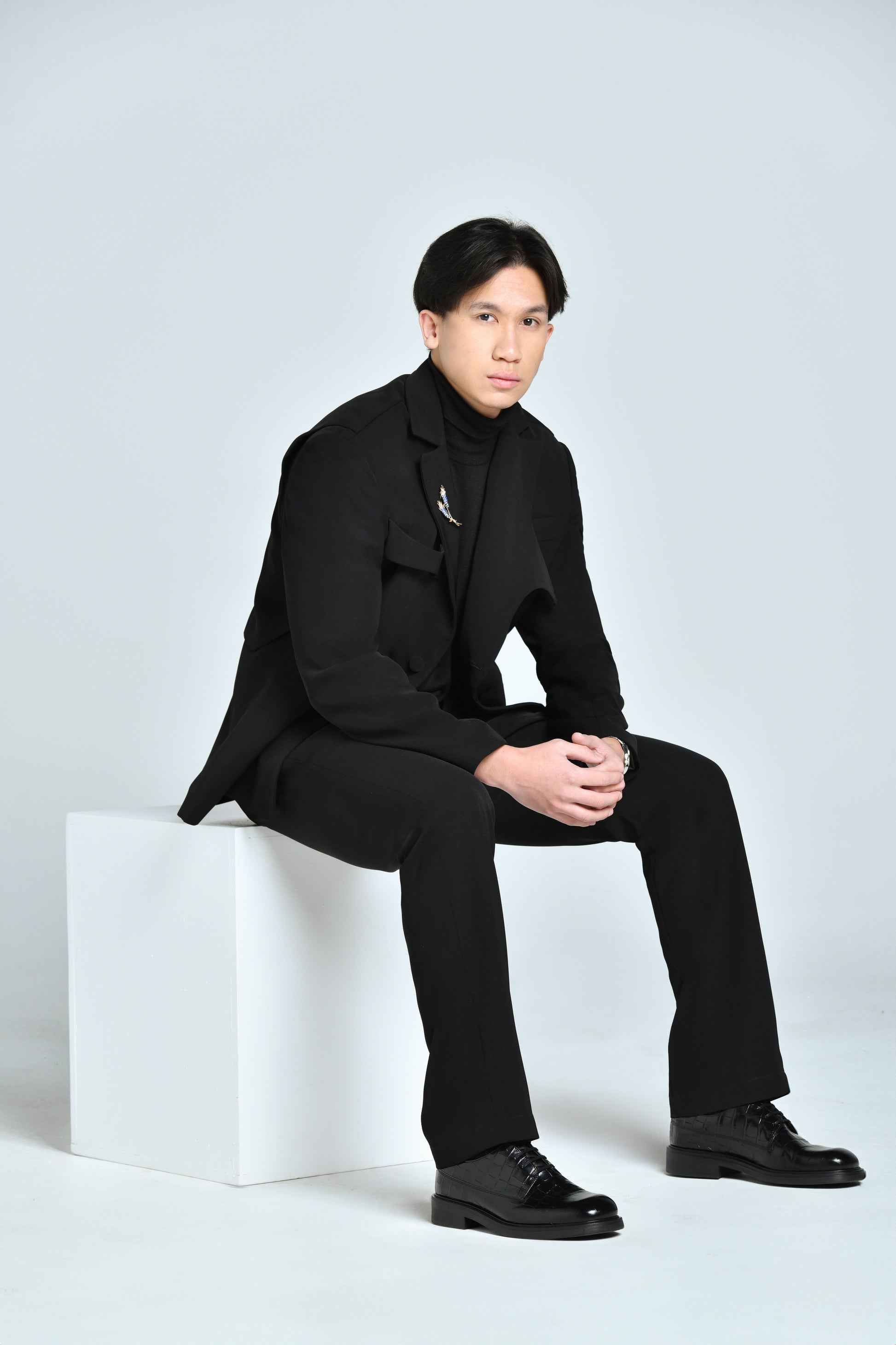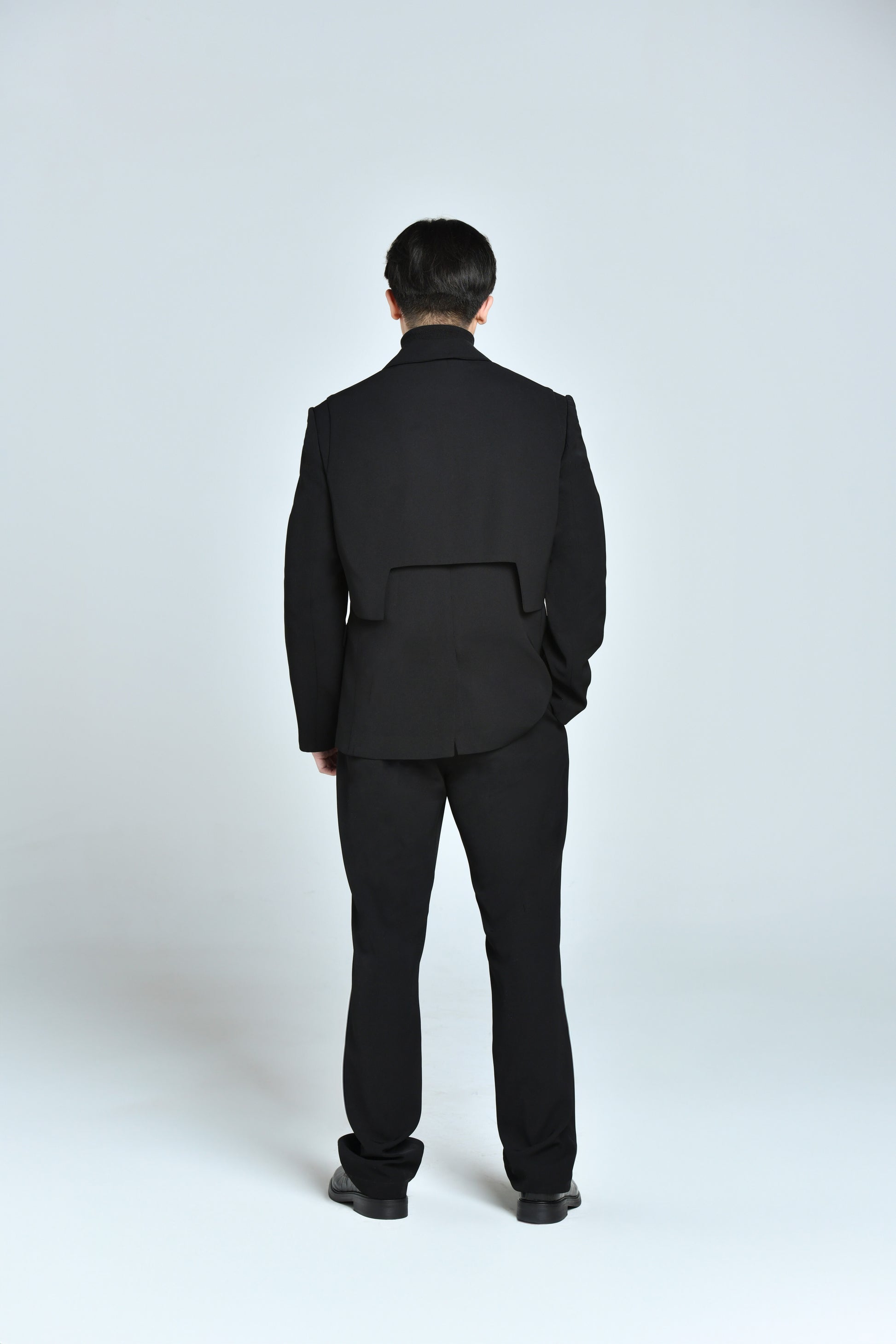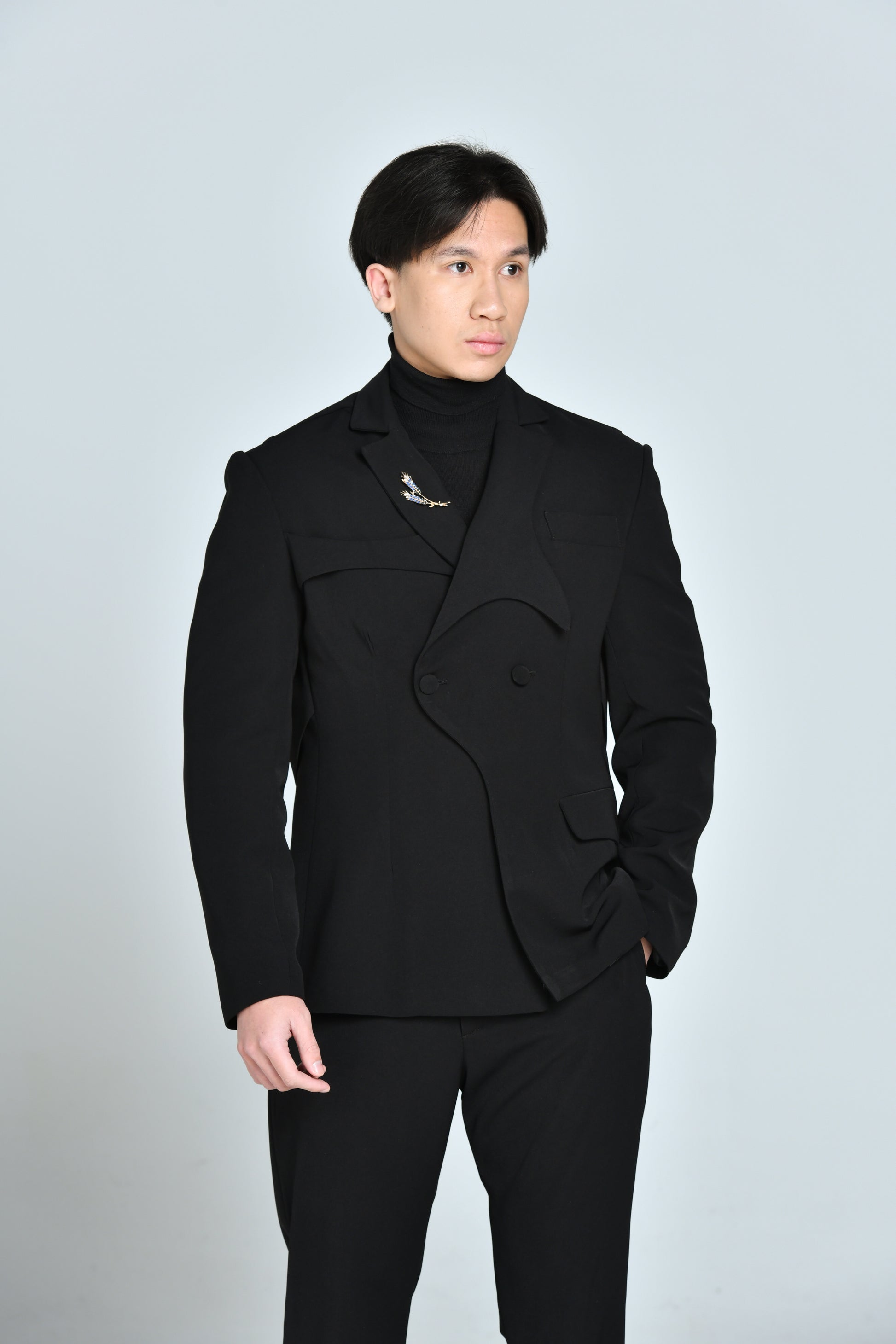 Poussant la Quintessence du tailoring à son maximum, Alvin Junior Mak, Directeur Artistique des collections masculines et féminines , Redéfini l'esthétique de la veste à deux boutons. Confectionnée en sergé de laine vierge noir, elle présente un col à revers crantés revisité sublimé d’une broche en or jaune certie d’une pierre bleu monochrome (ref : yves Klein) effet diamant, ainsi qu'une courbe de la patte de boutonage en «S », qui vient apporter une touche d’unicité à cette création.